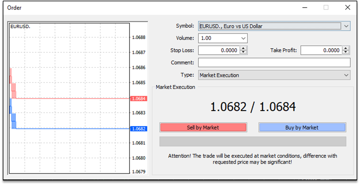The ‘Symbol’ field allows you to change the instrument and the ‘Volume’ field allows you to set the size of the trade (lot). You may also set stop-loss and take-profit levels.